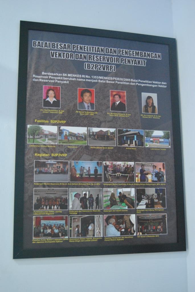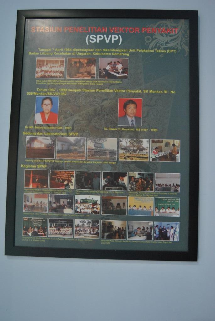Anjungan ini menggambarkan sejarah dan perkembangan B2P2VRP. Pada tanggal 7 April 1984 didirikan UPT Badan Litbang yang berdomisili di Ungaran, Kabupaten Semarang. Pada tahun 1987 hingga 1999 UPT tersebut berkembang menjadi Stasiun Penelitian Vektor Penyakit berdasarkan SK MENKES RI NO 556/MENKES/SK/VII/1987, dengan Kepala : Dr. MF Sustriayu Nalim pada periode 1984 hingga 1997 dan Dr. Damar Tri Boewono, MS pada periode 1997 hingga 1999.
