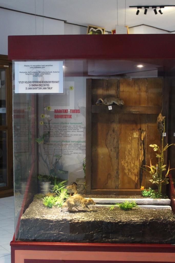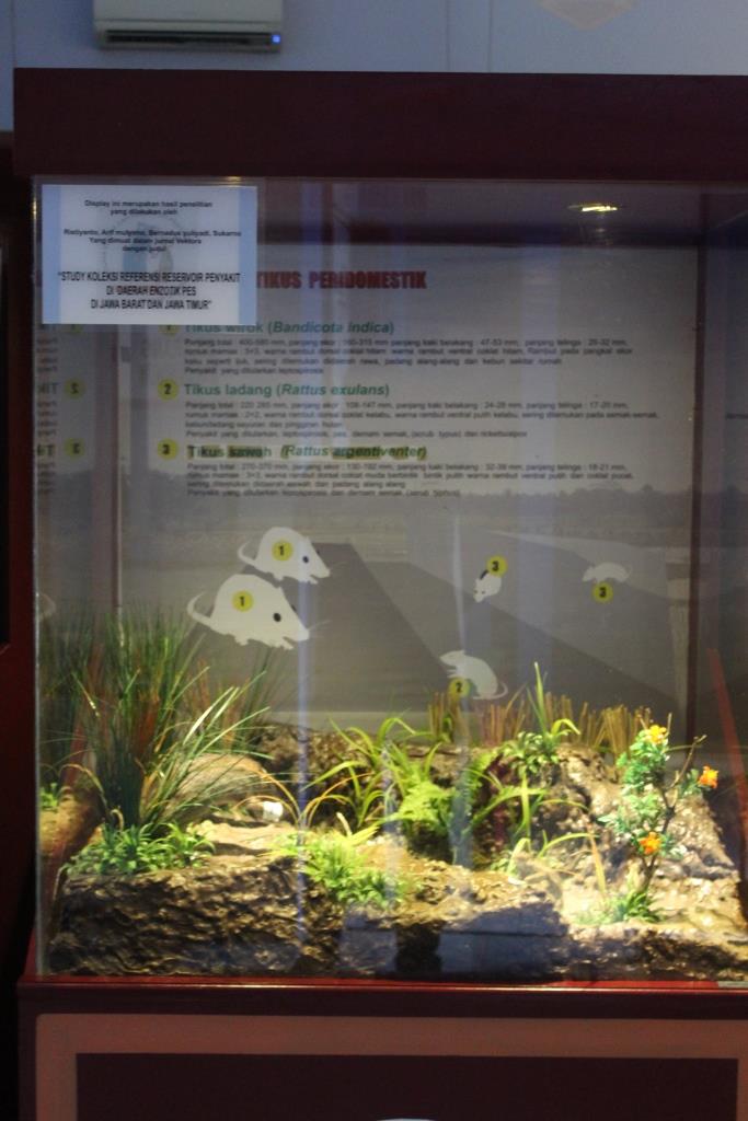 Display ini menampilkan habitat dan ciri morfologi tikus silvatik, tikus peridomestik dan tikus domestik berdasarkan penelitian "Koleksi referensi reservoir penyakit di daerah enzotik pes di Jawa Barat dan Jawa Timur".